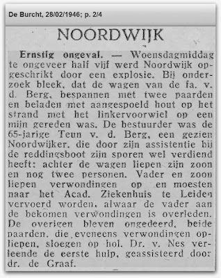 Teun van den Berg, een gezien Noordwijker die door assistentie bij de reddingsboot zijn sporen heeft verdiend, verongelukt dodelijk op het strand van Noordwijk wanneer zijn door een paard getrokken kar met het wiel een mijn raakt een explosie tot gevolg hebbend. De dappere mensenredder blijkt zelf niet te redden! Droevig. Eerder voltrok zich op het strand bij de Langevelderslag ook al een zware mijnexplosie waarbij 4 personen om het leven kwamen, Cock van Amsterdam, Gerardus Tolen, J. van Elk en Jasper van 't Wout. Op de site van de St.Jozef begraafplaats kunt u de gegevens vinden.